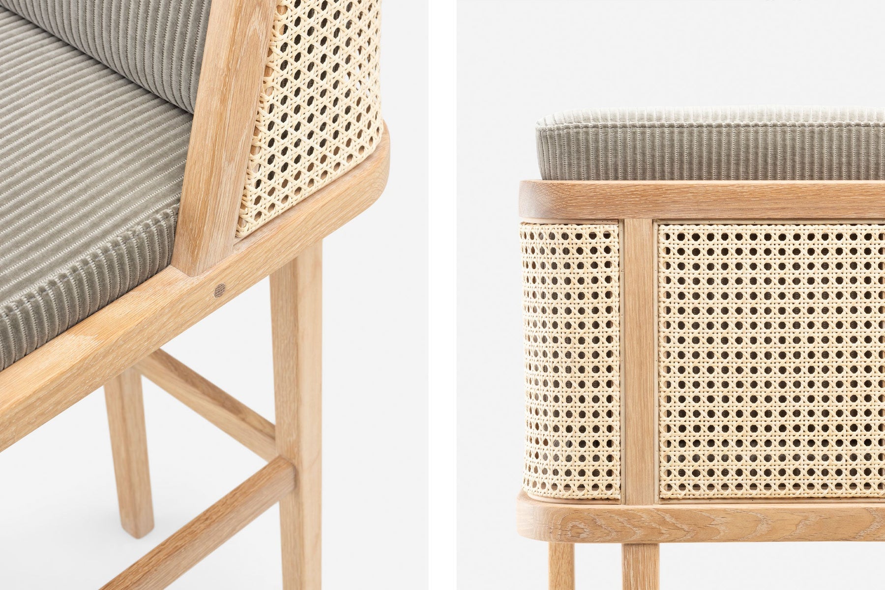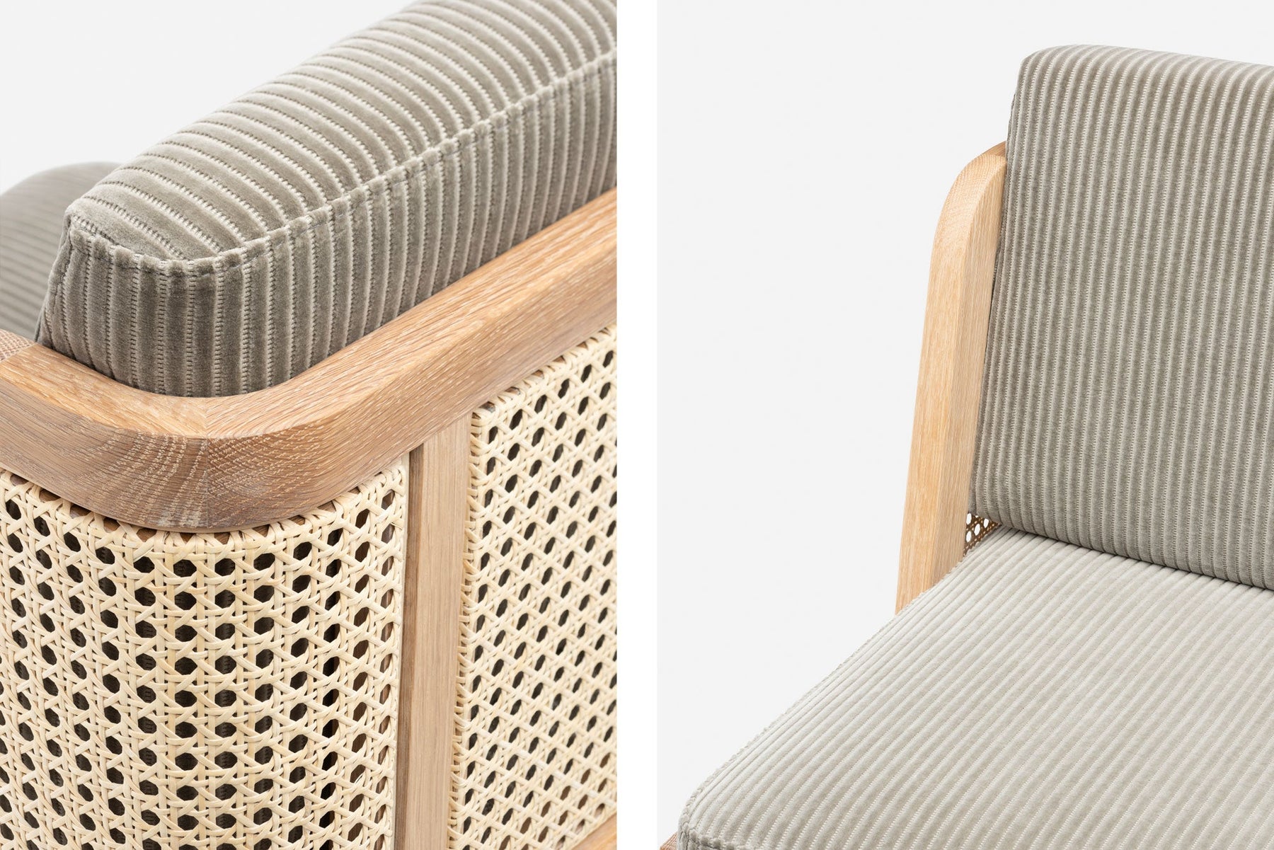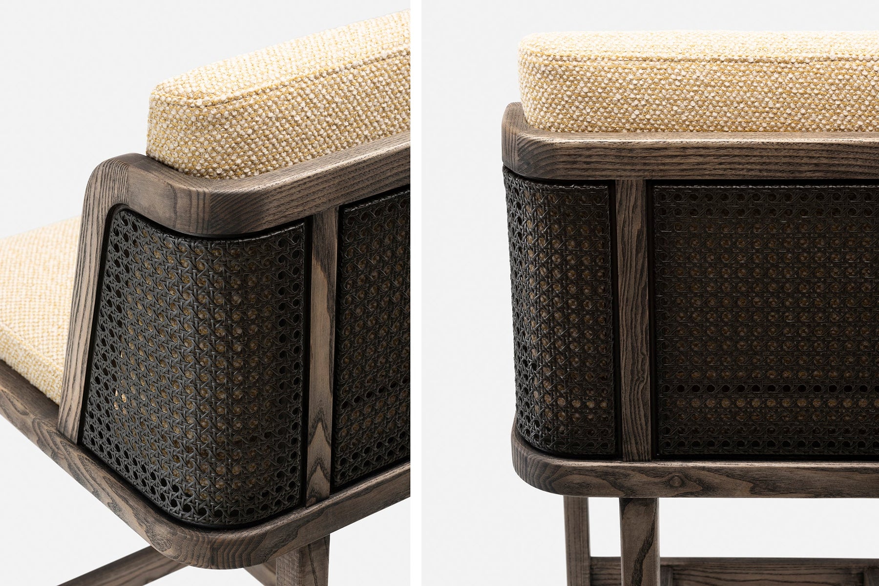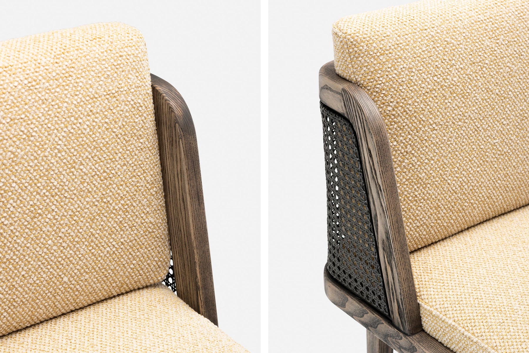 Available in black walnut, white oak, or ash in a range of finishes, and a range of fabric and leather options. Rattan backrest. The rattan finish varies according to the timber/finish chosen. See menus below for further material information.