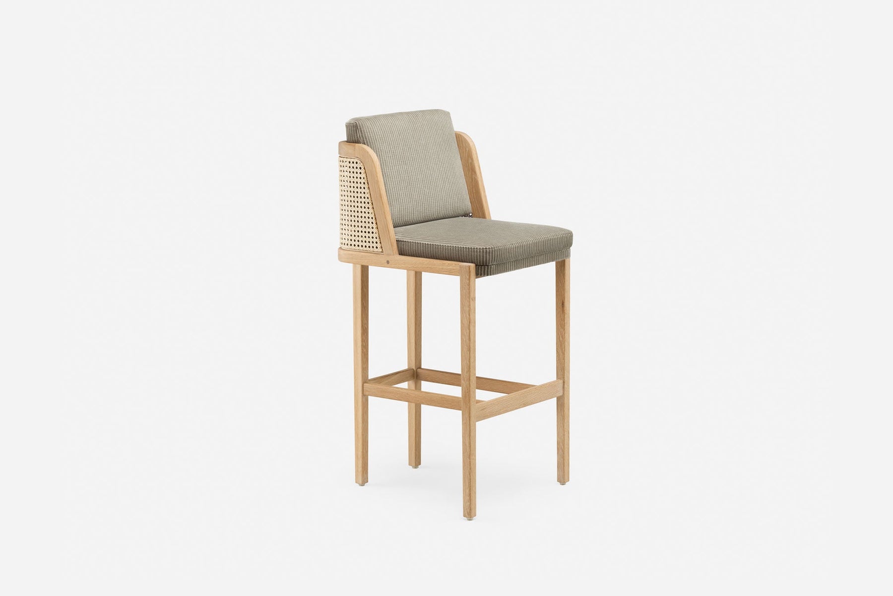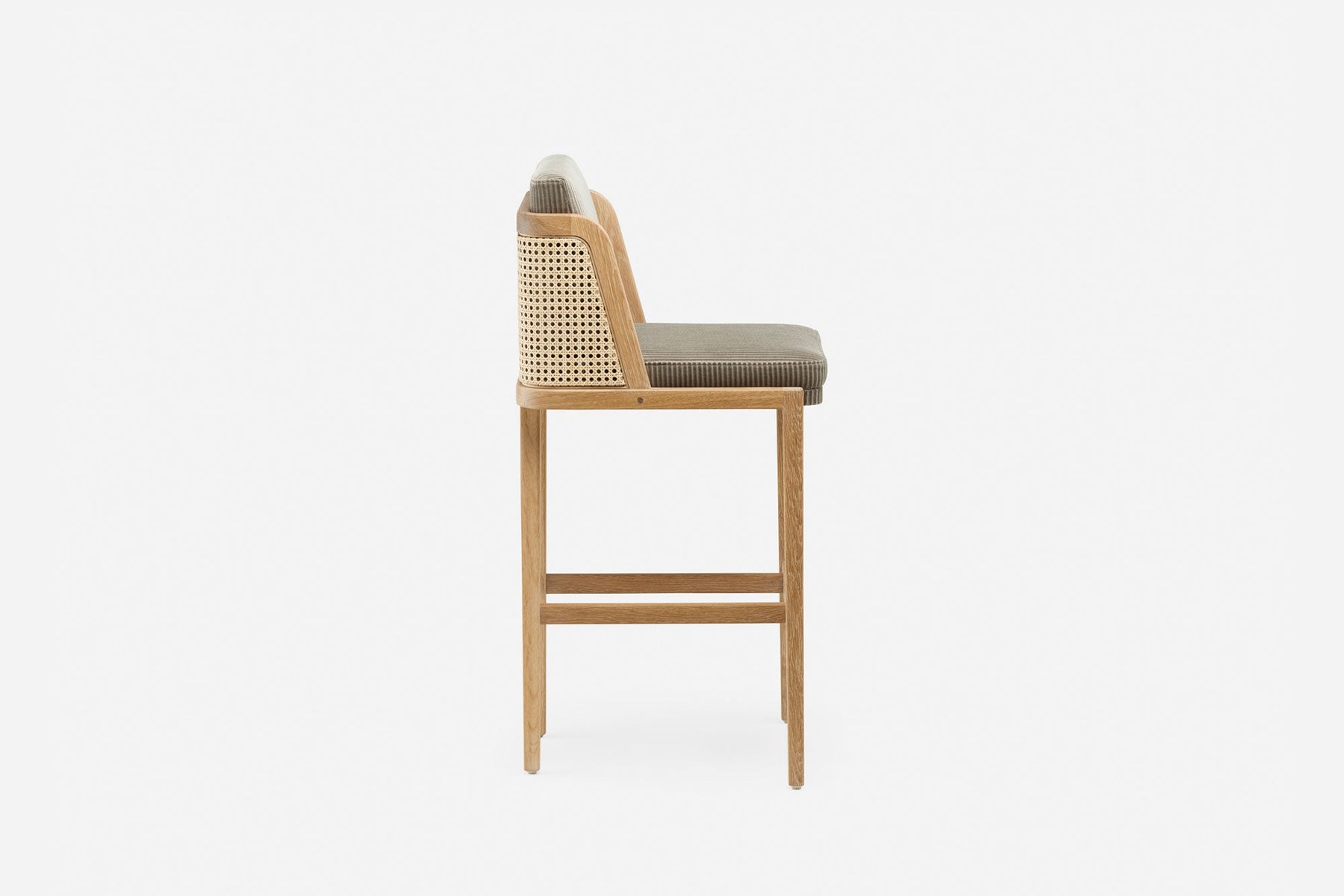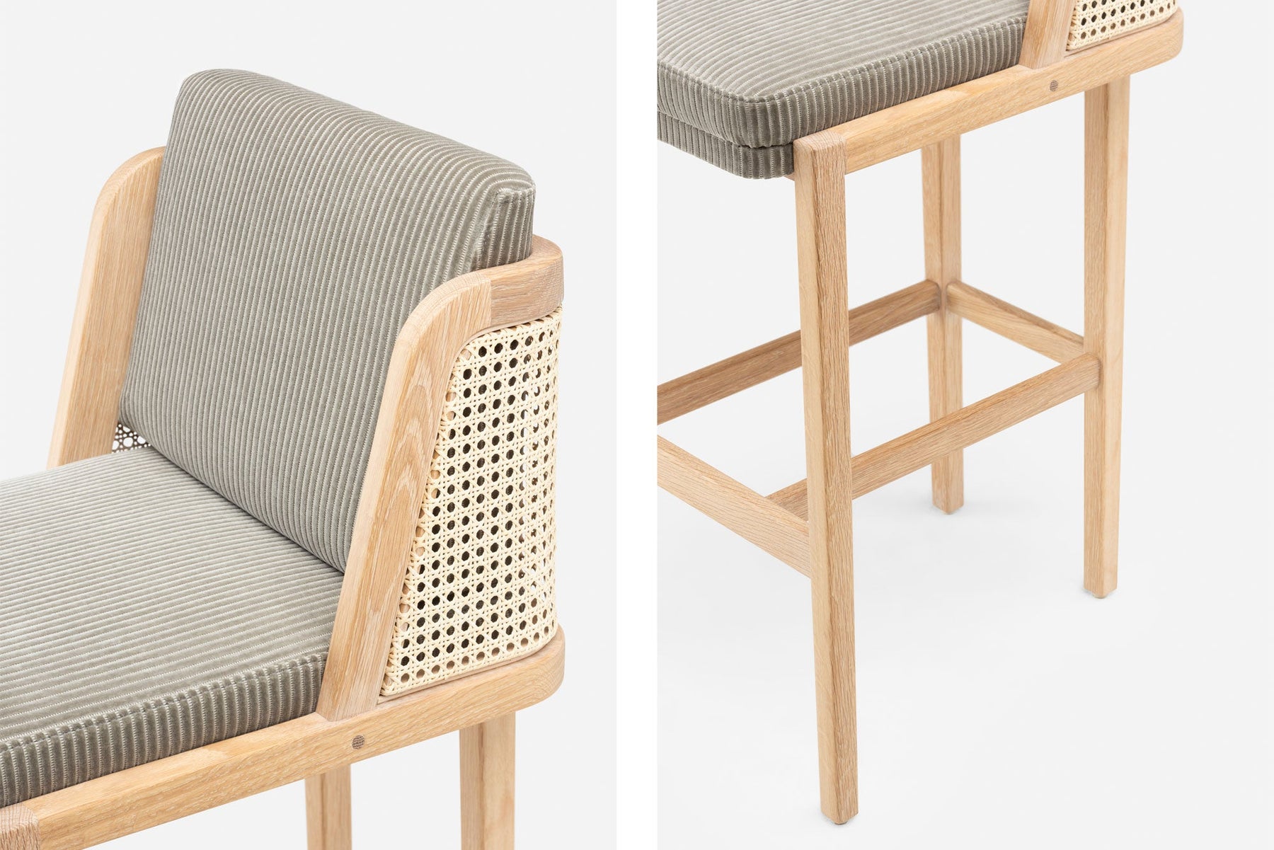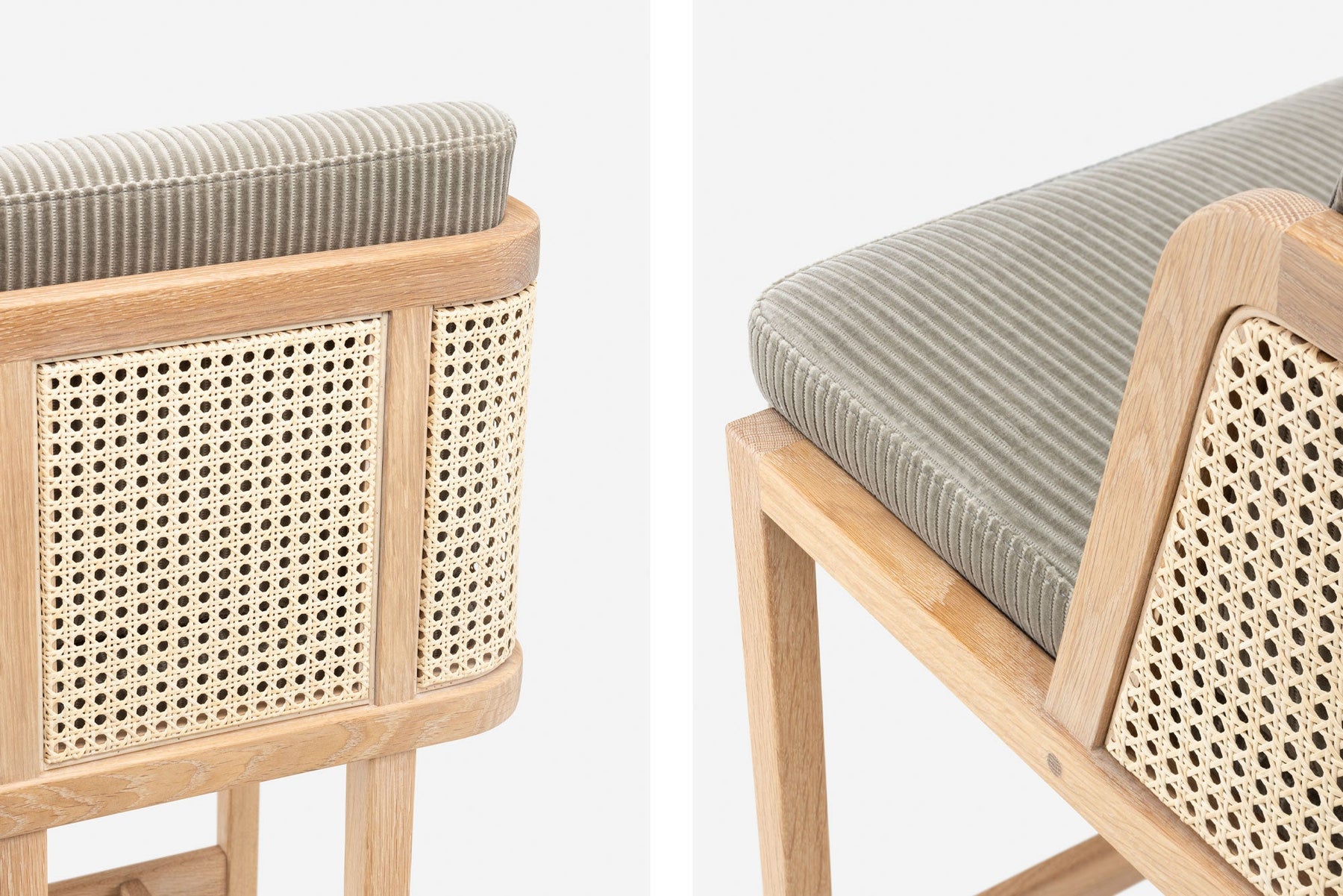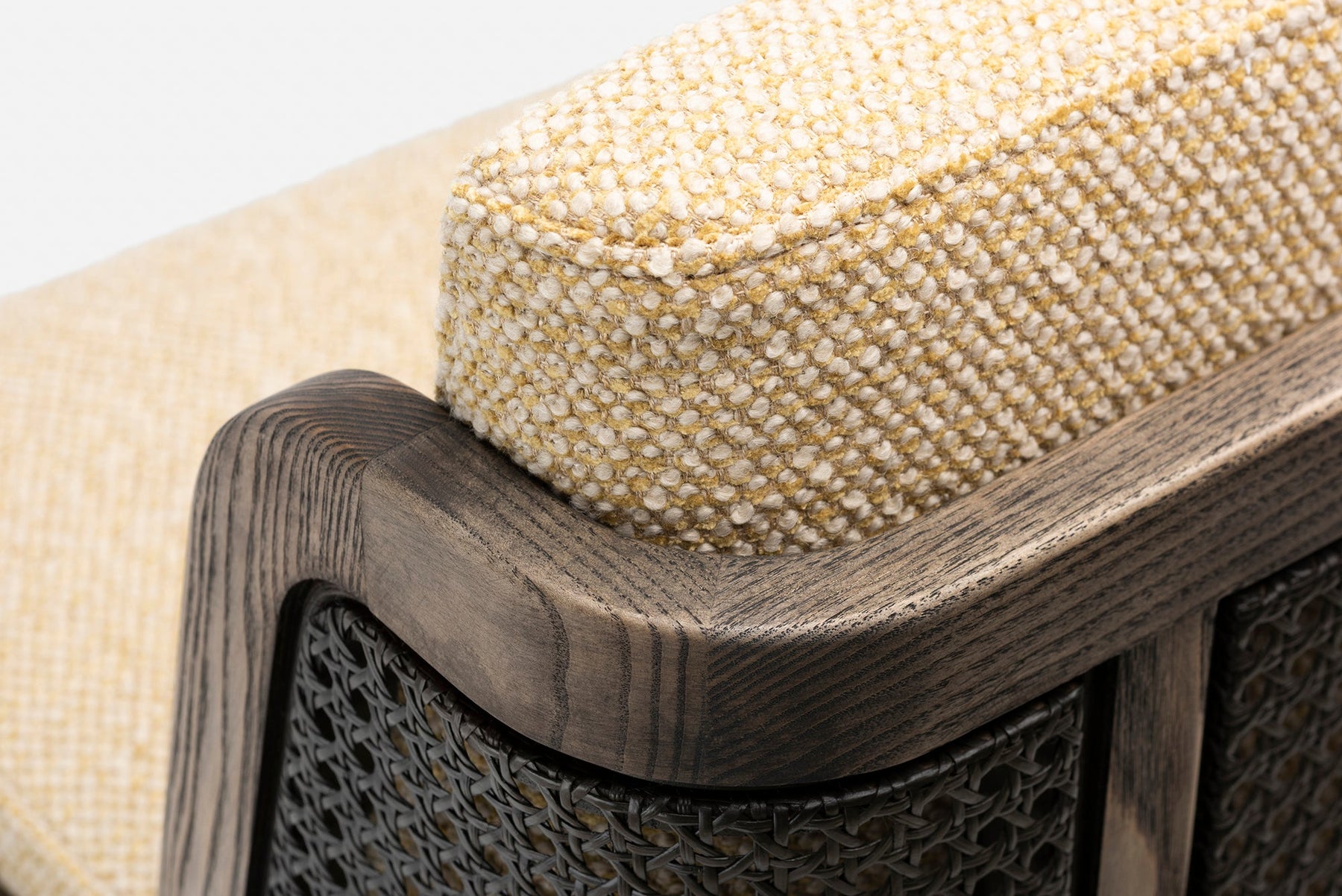 Available in black walnut, white oak, or ash in a range of finishes, and a range of fabric and leather options. Rattan backrest. The rattan finish varies according to the timber/finish chosen. See menus below for further material information.
