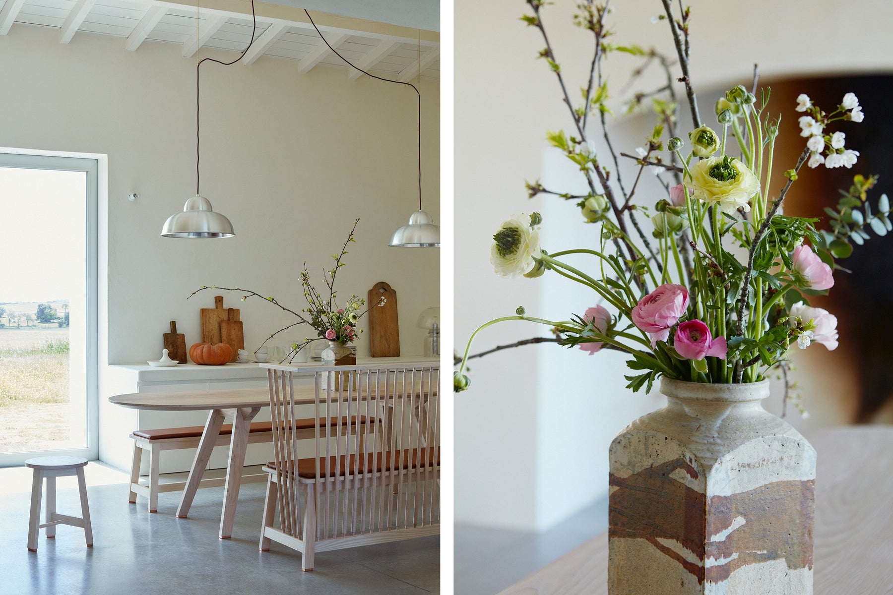 Timber is sustainable solid wood from North America or Europe, offering long-term repairability of the surface. Natural colour and grain variations in every plank make each piece an individual. Traditional wood joinery bonded with wood glue ensures structural integrity. All finishes are non-toxic and applied by hand, sprayed or rubbed.