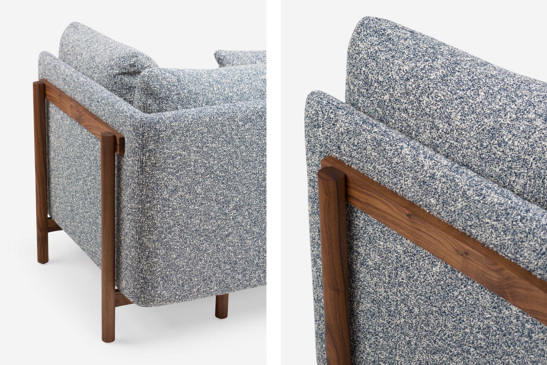 Available in black walnut, white oak, or ash in a range of finishes, and a range of fabric and leather options. See menus below for further material information.