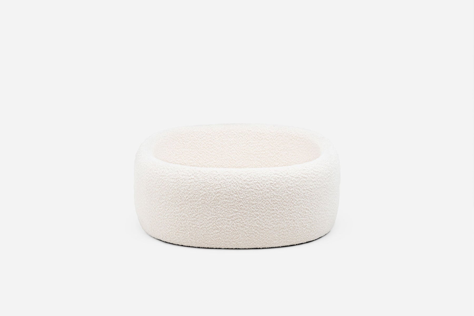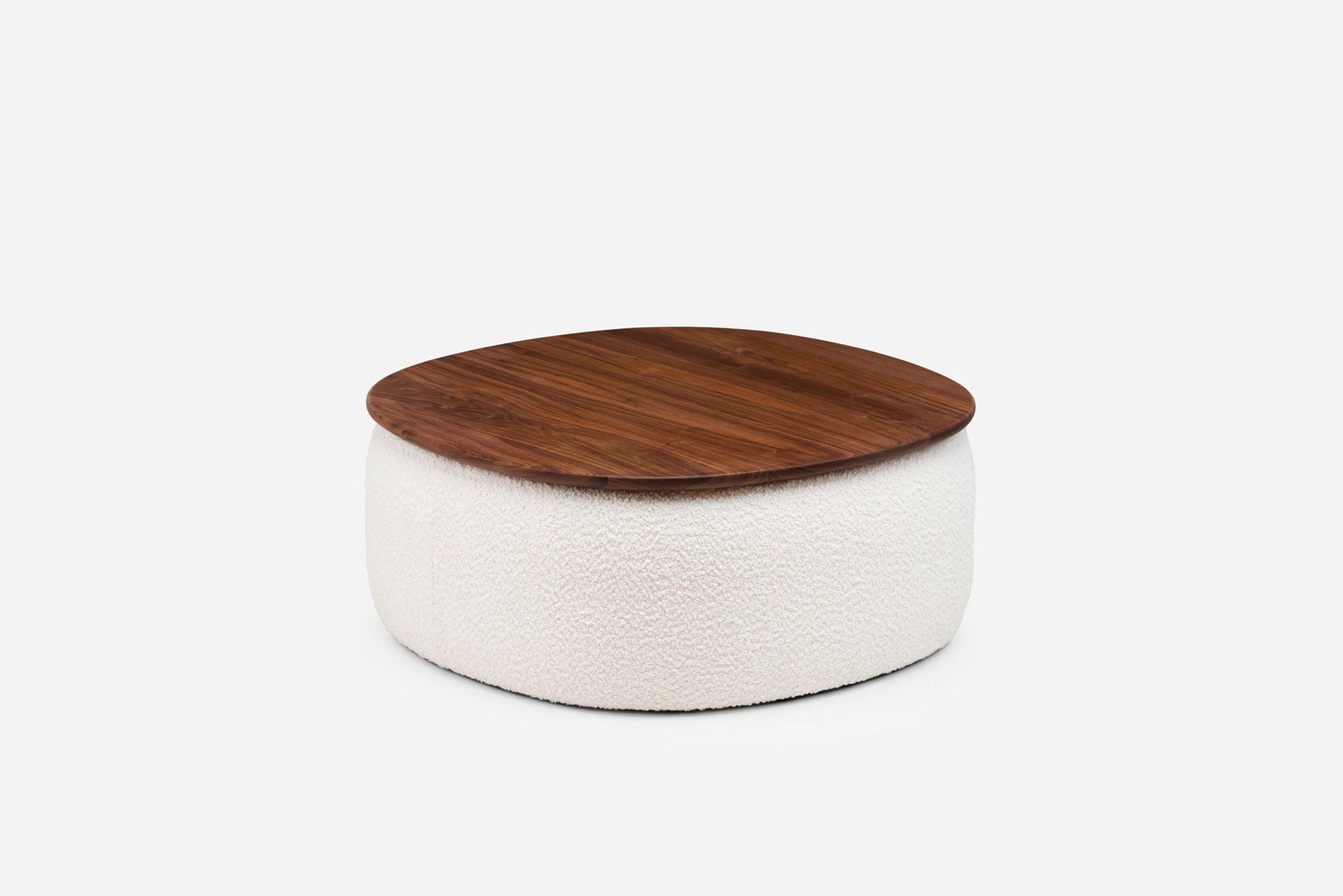 Flores, part of the Azores collection by Luca Nichetto, is a coffee table with a timber top set upon an upholstered base with an inner cavity for storage. The Azores collection comprises sofas and small tables, conceived as islands, allowing for flexible compositions to suit unique spaces. Each piece has a soft, rounded, sculptural shape made from luxurious upholstery and rich solid wood, highlighting the craft of De La Espada.